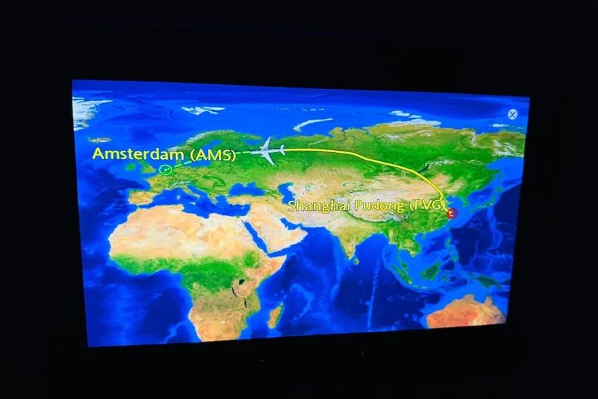 从上海出发,我们第一站是要飞到荷兰的阿姆斯特丹(飞行时间12小时10分钟)。