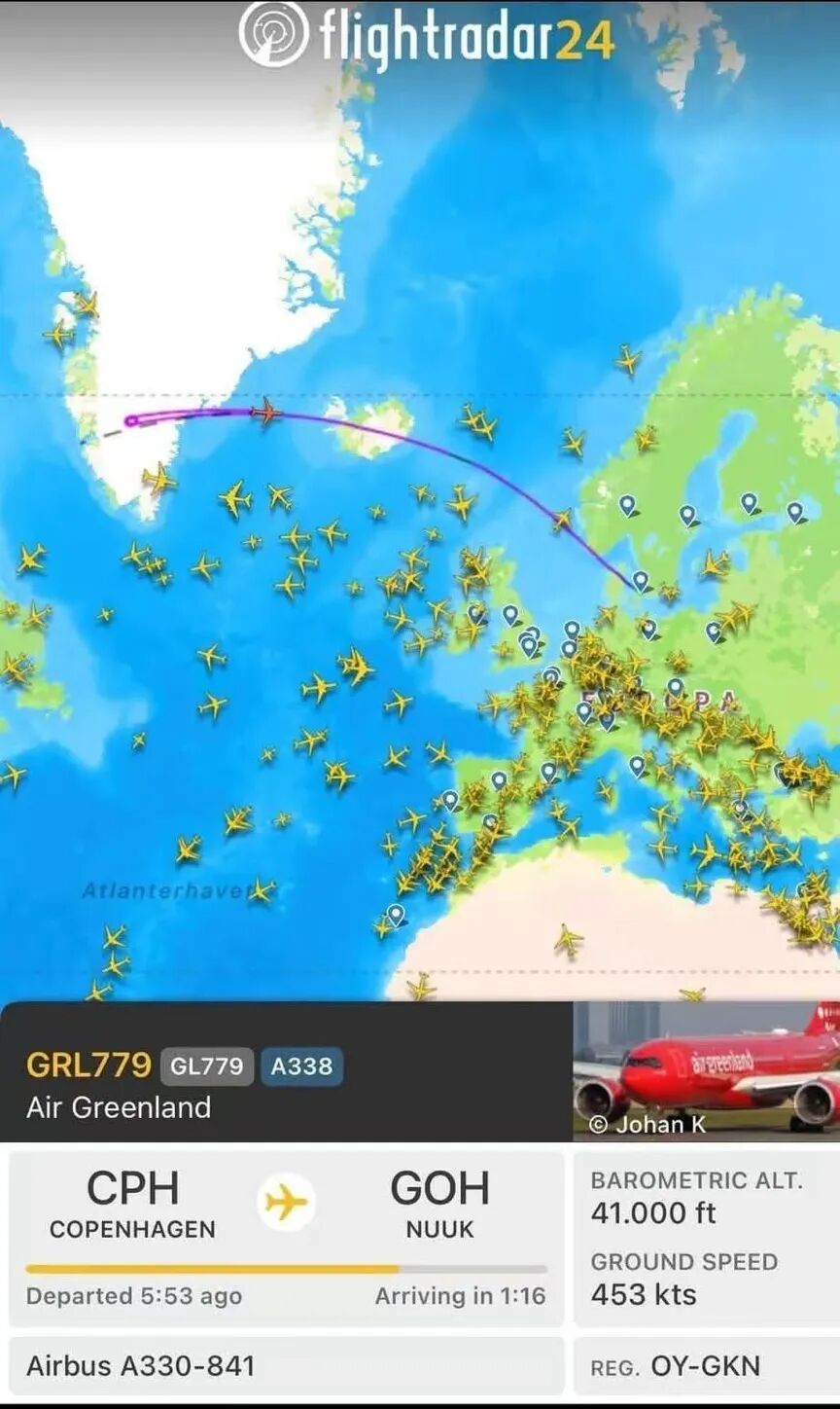 经过一天整顿后,再次踏上哥本哈根前往格陵兰岛的行程(飞行时间4小时50分钟)。