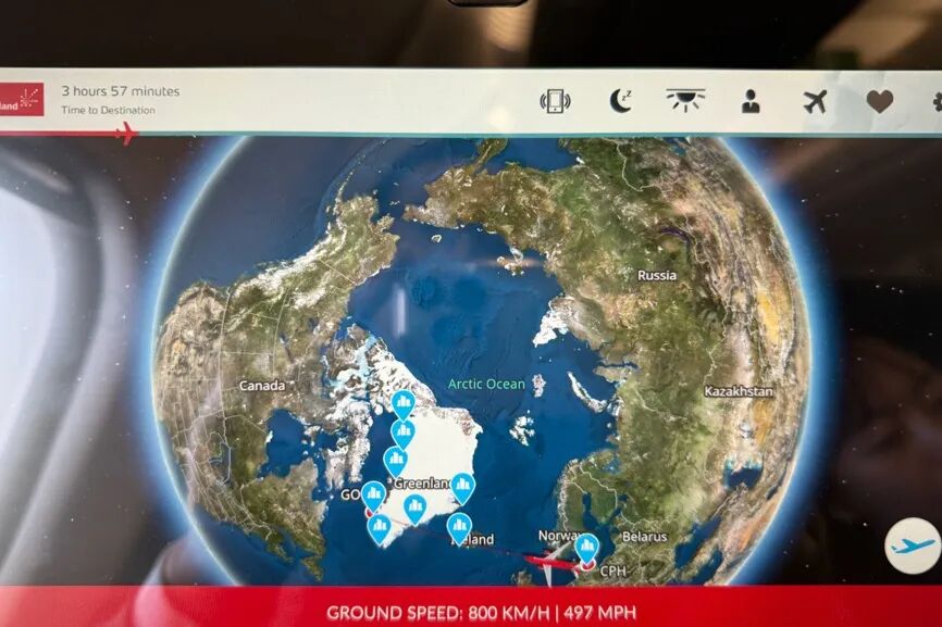 经过一天整顿后,再次踏上哥本哈根前往格陵兰岛的行程(飞行时间4小时50分钟)。