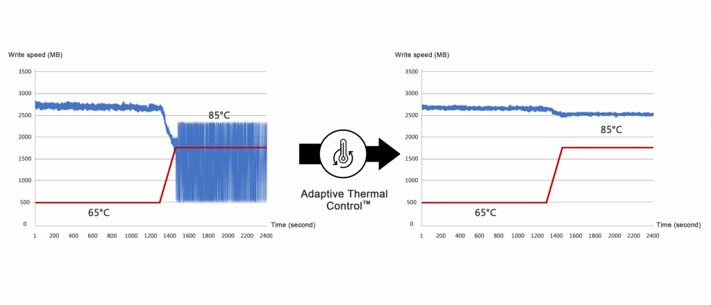 正如其名,Adaptive Thermal Control™(ATC)能无缝调节驱动器性能,以适应温度变化或应用读写行为。这种适应性确保了在无需用户或主机设备手动干预的情况下,实现最高持续性能。至誉科技还提供全面的定制服务,允许客户为搭载ATC的产品设置个性化热阈值。对于热敏感应用,可设定更低的阈值以启动热控机制。